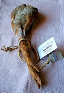 Si tratta di un piccolo prosciutto: un famoso chef gli ordina solo i busti di maialetto, così Alfredo stagiona le cosce e ci fa questi prosciuttelli formato bonsai. La carne è leggermente tenace, infiltrata di grasso profumatissimo, insaporita da Dio, sapida ma non salata. Col pane sciapo, ci canta.
